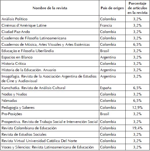 En cuanto a los 31 artículos en revistas indexadas, hay publicaciones colombianas (n=23, 74,2%), así como de otros países latinoamericanos (n=5, 16,1%) y europeos (n=2, 9,4%). De acuerdo con las clasificaciones temáticas registradas en Latindex y Publindex, 15 de estos artículos se encuentran en revistas de educación y pedagogía (48,4%), 15 en revistas de otras disciplinas de las ciencias sociales y humanas (48,4%) y uno en una revista multidisciplinar (3,2%).
