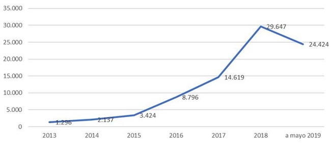 Las solicitudes de refugio ante la Comisión Mexicana de Ayuda a Refugiados (Comar) han aumentado de manera exponencial: de 2013 a 2015 las solicitudes casi se triplicaron; de 2015 a 2018 fue incluso mayor; entre 2014 y 2018 las solicitudes de refugio se dispararon más de 1100%. Se trata de un aumento sorprendente y muy acelerado. Las cifras continúan creciendo, solo de enero a mayo de 2019 la cifra de solicitudes casi alcanzó la totalidad de 2018 (véase Gráfica 1).