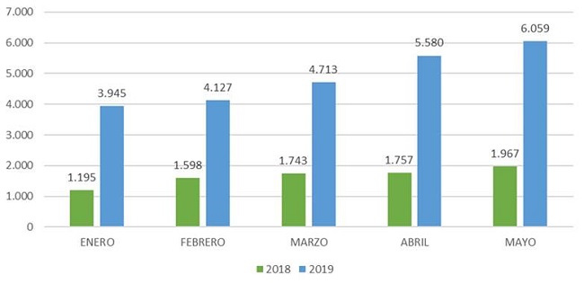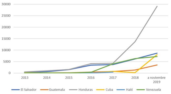 De 2018 a 2019 se evidencia un aumento sustancial (véase Gráfica 2). Observando solo estos primeros cinco meses, hubo un aumento de solicitudes de refugio a México, paralelo al endurecimiento de las políticas antimigratorias de Estados Unidos. Estos meses coinciden con hechos importantes en los flujos migratorios, las caravanas y la entrega de visas humanitarias (Agencia AFP, 2019, enero 23).