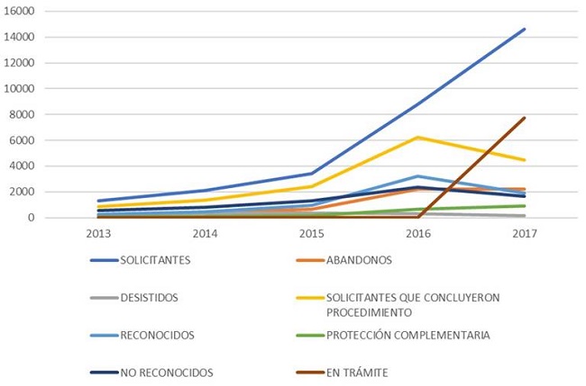 El caso de solicitantes de refugio de Haití también es interesante por su variabilidad en los últimos años: en 2013 hubo tan solo 14 solicitudes; en 2014 hubo 25; en 2015 solo 16; en 2016, 47; y en 2017 aumentó a 436. Además, tras el terremoto de 2010 miles de personas de ese país migraron a distintos países de Sudamérica, en su mayoría a Brasil; posteriormente llegaron a México con la intención de buscar asilo político en Estados Unidos. Se trata de un proceso migratorio de años que se incrementa, sobre todo, por factores coyunturales, por ejemplo, tras el huracán de 2016. De acuerdo con los datos del INM, en 2016 entraron a México 17 078 haitianos y 852 en los primeros meses de 2017. La mayoría de ellos no fueron solicitantes de refugio en México, aunque sí terminaron asentándose en Tijuana y Mexicali, algunos solicitando la residencia.