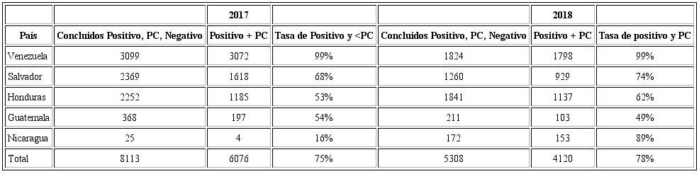 Esto pone de relieve otro tema importante sobre las solicitudes de refugio: la «tasa de positivos» con relación al total de procesos concluidos ante la Comar, es decir, la tasa de aceptación de las solicitudes de refugio según nacionalidad también ha variado en años recientes. Mientras el caso de Venezuela ha tenido una tasa positiva de 99% en 2017 y 2018, la de nicaragüenses es donde hubo mayor variabilidad en los años recientes, con una tasa de positivos de solo 16% en 2017 y de 89% en 2018. Para los hondureños, 53% de los procesos concluidos en 2017 fue positivo y en 2018 fue de 62%. En el caso de Guatemala, 54% en 2017 y 49% en 2018 (véase Tabla 1).