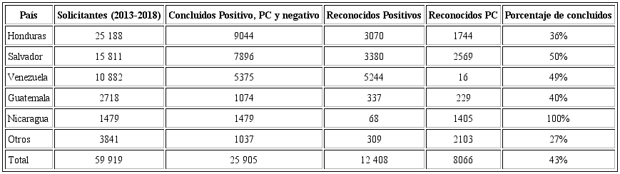 Ante este gran aumento de solicitudes de refugio de tan diversas nacionalidades, el porcentaje de trámites concluidos disminuyó (véase Gráfica 4). La Comar ha señalado públicamente estar saturada. Las resoluciones en trámite o pendientes aumentan y se demoran mucho más en tener respuesta (Gándara, 2019, diciembre 9). En este dato también se puede percibir cierta variabilidad entre las nacionalidades. De los 25 188 solicitantes hondureños entre 2013-2018, han concluido 9044 (36%). Del total de solicitudes de todas las nacionalidades en 2013-2018, solo 43% han concluido (véase Tabla 2).