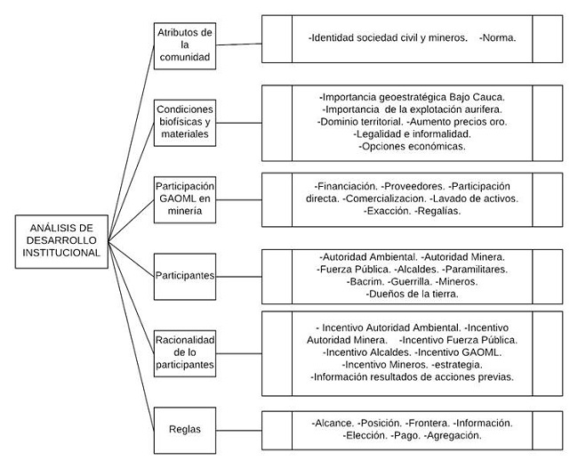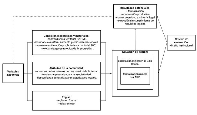 Se estudia el caso de las ARE en el Bajo Cauca antioqueño usando el marco ADI, con el fin de comprender de manera amplia y estructurada el contexto que condiciona la posibilidad de formalización en la subregión, dado el esquema de anidamiento conceptual que plantea el marco y que permite entrelazar elementos específicos de un nivel analítico con otros de nivel superior. De este modo, la formalización minera, un proceso que desde lo jurídico tiene una apariencia eminentemente técnica, puede ser encuadrado en el contexto histórico, social, territorial y bélico que condiciona su implementación real.