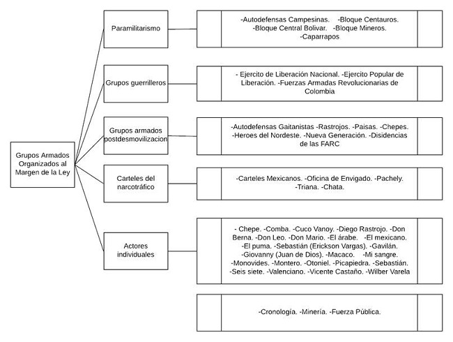 La preponderancia de los grupos armados organizados al margen de la ley (GAOML) en la configuración institucional de la subregión y la complejidad que implica estudiar la formalización minera en un territorio de soberanía en vilo, instó a una focalización en los GAOML, en aras de mejorar la comprensión de las relaciones de poder históricas en la subregión. Para esto se hizo una revisión parcial de prensa que abarcó un periodo de diez años (2008-2018), en el que se revisaron 62 noticias de diversas fuentes (véase anexo A). Se hizo una sistematización de la información implementando enfoque inductivo de categorización, estableciendo tres categorías independientes y cinco macrocategorías que, a su vez, anidan 44 subcategorías (véase Figura 3).