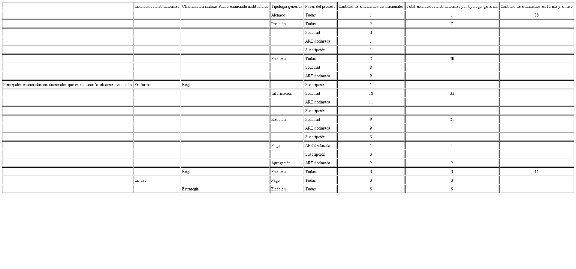 En este apartado se hace un acercamiento a los enunciados institucionales que estructuran parcialmente la SA estudiada. Se tiene en cuenta la distinción hecha por Ostrom entre «reglas en forma» y «reglas en uso» (2015, p. 196) (véase Tabla 1).