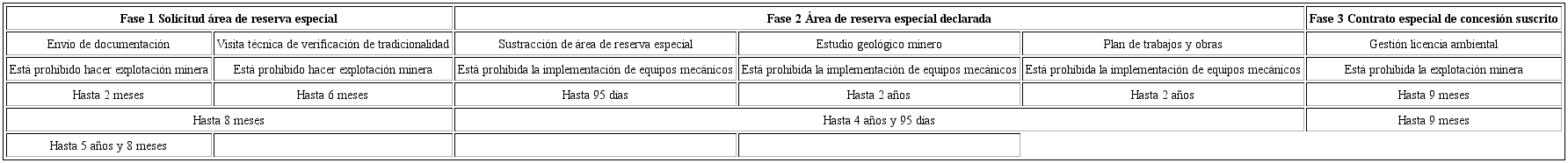 En lo que atañe a las reglas de elección, durante la fase de solicitud, que puede durar hasta ocho meses (véase Cuadro 1), se niega la posibilidad de explotar el recurso que brindaría el sustento económico a la comunidad y que representa el sustrato probatorio de la tradicionalidad que evalúa la autoridad minera.5 Se genera una situación paradójica en la que el alcalde, que previamente pudo haber certificado la existencia de una comunidad de mineros con explotaciones tradicionales, se ve compelido posteriormente a detener la explotación «ilícita» de dicha comunidad. En la segunda fase está permitida la explotación, pero sin medios mecanizados. En la tercera fase de nuevo se niega la explotación hasta que no se obtenga la licencia ambiental.