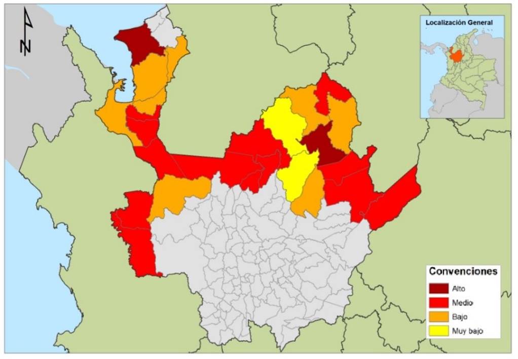 Los seis municipios del Bajo Cauca son los que más retos institucionales representan para alcanzar la paz territorial, la paz ambiental y para implementar el PRCC. Existe un control social alto de la población civil por parte de los grupos armados organizados y el ELN: «[Hay] un vacío de autoridad generado por la incapacidad institucional de lograr el monopolio de la violencia, la administración de justicia y la prestación de servicios básicos» (Pares, 2019, p.9). Asimismo, los cultivos de coca han aumentado y persiste la extracción ilícita aurífera y de otros materiales. En el ámbito ambiental la deforestación es constante y se prevé una ola de desertificación a 2040 desde la costa Atlántica, la cual puede llegar a adelantarse de seguir las condiciones socioeconómicas y ambientales del momento (comunicación personal, funcionarios Corantioquia, septiembre 9, 2019; funcionario MAPP/OEA, septiembre 12, 2019; Secretaría de Minas, 2017).