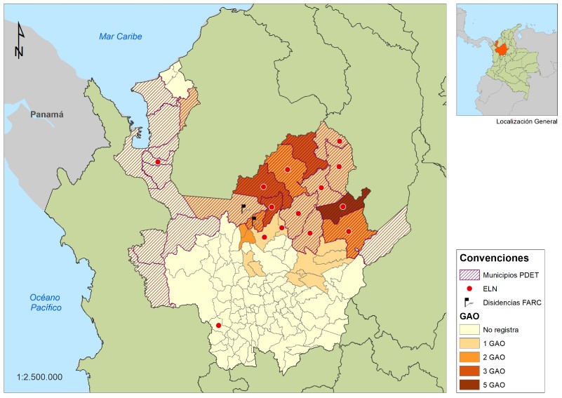 Para el caso de Antioquia, el Decreto 1650 de 2017 establece 55 municipios Zomac -44% del territorio departamental-, de ellos 24 son PDET clasificados en cuatro subregiones PATR.4 Empero, el departamento solo tiene dos subregiones PATR -Bajo Cauca y Nordeste, y Urabá- que en total recogen 21 municipios PDET.