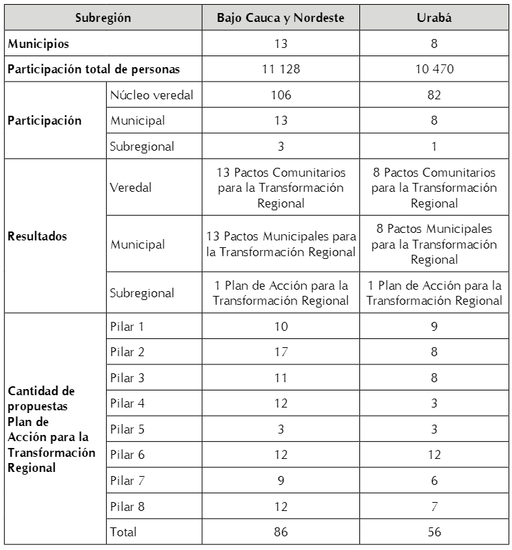 En lo que respecta a los municipios de las subregiones PATR de estudio, se consolidaron 142 iniciativas. De estas se destaca la necesidad de las comunidades del Bajo Cauca y Nordeste por apropiar a profundidad los temas relativos al pilar 8, posiblemente debido al historial de conflictividad dentro del cual han estado inmersas; contrario a lo que sucede en el Urabá, que se enfocó primordialmente en reforzar lo relativo al pilar 6 (véase Tabla 2).