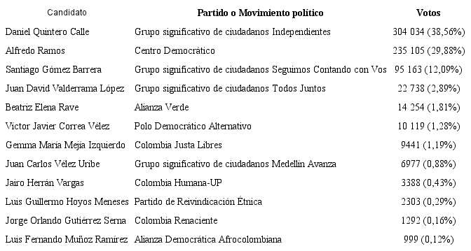 Daniel Quintero tuvo como principal rival a Alfredo Ramos del Centro Democrático, el partido del expresidente y principal barón electoral en Antioquia, Álvaro Uribe, a su vez apoyado por una coalición derechista de los partidos Conservador, MIRA, Alianza Social Independiente y Partido de la U. El resto de los rivales, en una suerte de combinación de antiguas figuras políticas, burócratas o activistas sociales, se movieron entre dichas opciones independientes y partidistas, terminando de barrer el voto de izquierda a derecha.