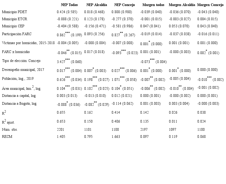 La Tabla 1 muestra los resultados de este análisis. Las primeras tres columnas muestran los resultados para modelos en los que la variable dependiente es el NEP electoral para todas las elecciones y luego para elecciones de Alcaldía y Concejo únicamente. Las últimas tres columnas repiten el ejercicio, pero cambia la variable dependiente por la otra medida de competitividad: el margen de victoria. Cada fila muestra el coeficiente para cada variable independiente, el cual indica la dirección -el signo- y la magnitud -el número- de la asociación con la variable dependiente. Entre paréntesis se indica el error típico y los asteriscos indican niveles de significancia -valores p-. Al final de la Tabla 1 se incluye información general sobre cada modelo y su ajuste a los datos.