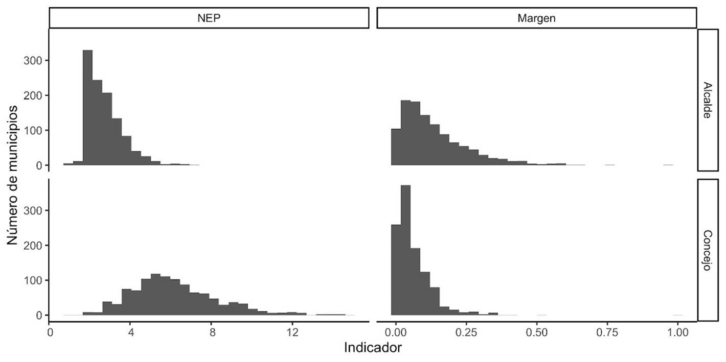 Como medida de fragmentación electoral se calculó para cada municipio -para elecciones de Concejo y Alcaldía- el número efectivo de partidos (NEP) electoral según la fórmula de Laakso y Taagepera (1979). Asimismo, se calculó para las elecciones de Concejo y Alcaldía en cada municipio el margen de victoria, entendido como la diferencia entre la proporción de votos obtenidos por el partido más votado y la proporción de votos obtenidos por el segundo partido más votado. Estas dos medidas constituyen la operacionalización de la variable dependiente: la competitividad de las elecciones locales. Estas son las mismas variables discutidas en la Gráfica 1.