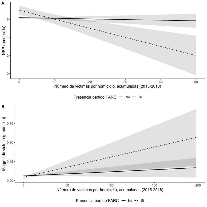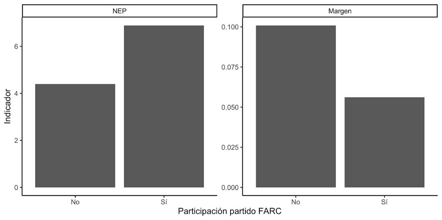 Se encontró que la participación de FARC tiene un efecto positivo en la competitividad de las elecciones: los municipios en los que FARC participó tendieron a tener un número efectivo de partidos mayor y un margen de victoria menor. Sin embargo, dicho efecto está condicionado por la violencia sufrida en cada municipio en tiempos recientes: a mayor número de homicidios acumulados reportados en el RUV menos competitivas fueron las elecciones locales en los municipios en que FARC participó. Es decir, los municipios con mayores tasas de violencia y donde hubo participación del partido FARC presentan, en promedio, menor NEP y mayor margen de victoria. Este hallazgo concuerda con estudios recientes que encuentran que el comportamiento y actitudes políticas en el país dependen de factores relacionados con el conflicto armado y la exposición a la violencia (Gallego, 2018; Tellez, 2018).