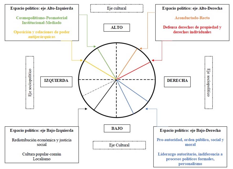 La propuesta de Ostiguy (2009a), ilustrada en la Figura 1, contempla dimensiones del espacio político de acuerdo con las cuales: