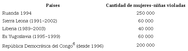 Al margen de la dificultad para conocer la cantidad real de violaciones en los conflictos armados -debido, en parte, a la impunidad y al estigma de las mujeres violadas para denunciar-, los datos recogidos, aunque sesgados, muestran una amplia dimensión del problema (véase Tabla 1).