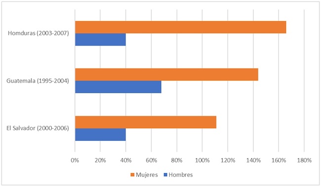 Las tasas de las mujeres se duplican, triplican y cuadriplican, observándose un aumento específico de estas en situaciones no solo de conflicto, sino también de «pacificación» (Carcedo, 2010, pp. 40-42).