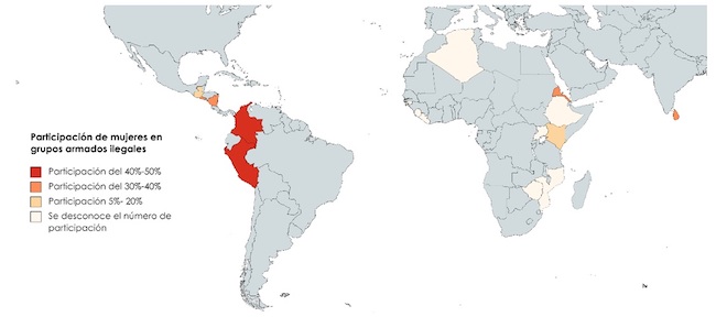Por tanto, las mujeres que han pertenecido a estructuras militares son disidentes de los roles femeninos tradicionales y de las expectativas que se tenían sobre ellas. Así pues, los numerosos ejemplos de mujeres como combatientes activas o sujetas políticas de los conflictos armados muestran que los estereotipos de género conllevan a una visión «miope o ingenua» (Bell y Narayanaswamy, 2003, p. 13). Al enfocar la mirada hacia la presencia de las mujeres como victimarias en los distintos conflictos armados se puede observar la magnitud de este fenómeno (véase mapa 1).