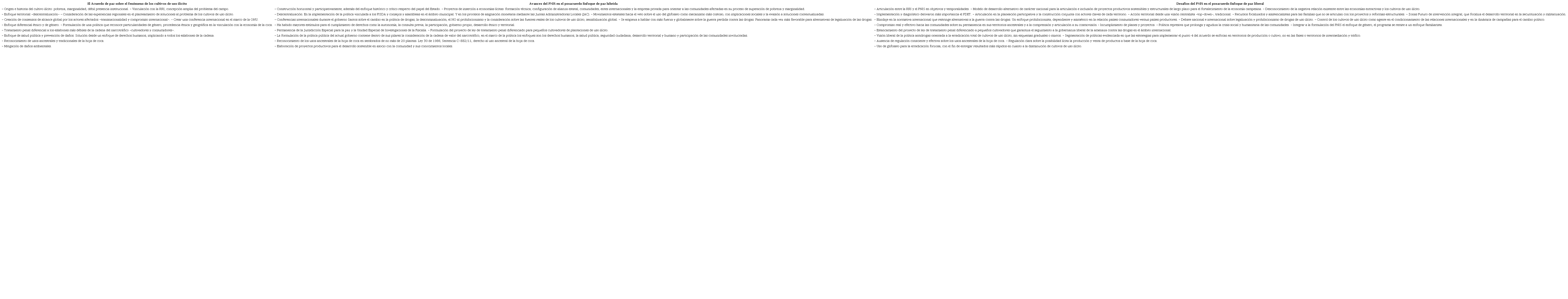 El Acuerdo de paz en Colombia se acerca a la formulación de una nueva concepción híbrida y contextualizada de la paz frente al problema de las drogas y los cultivos de uso ilícito que incluye el reconocimiento de las causas históricas que facilitaron la vinculación de poblaciones vulnerables con las economías ilegales, una visión descentralizada de las políticas con un enfoque transversal a la Reforma Rural Integral (RRI) apalancada por la creación de espacios y acuerdos locales para la implementación del PNIS, el reconocimiento a las particularidades étnicas y sociales de las comunidades cocaleras y un enfoque de salud pública en lo referente a la prevención y no estigmatización de los cultivadores y consumidores. Asimismo, el Acuerdo dejó plasmada una visión internacional del fenómeno, enfatizando en el enfoque de corresponsabilidad entre países productores y consumidores en la formulación de una política antidrogas menos punitiva, considerando los errores precedentes de intentos de erradicación desde la criminalización y la militarización de las zonas cocaleras.