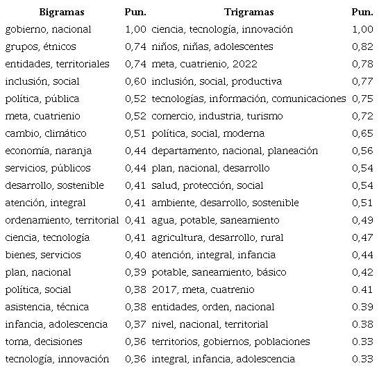 Vale la pena resaltar que entre los bigramas más frecuentes se encuentra economía naranja, concepto que frecuentemente aparece como motor de desarrollo en el discurso del presidente de la República. Asimismo, la importancia de los ODS se ve reflejada en la presencia de desarrollo sostenible en la Tabla 2. De igual forma, la preocupación por el cambio climático es evidente en el PND. Alrededor de este asunto se encuentran vecinos cercanos como adaptación, mitigación, riesgo, gestión y desastres. Un tema cercano conceptualmente al cambio climático es ambiente, este tema también tiene presencia en la Tabla 2, donde se ve acompañado de desarrollo sostenible. El conjunto ciencia, tecnología, innovación (CTI) es el trigrama más frecuente. Este resultado contrasta con el hecho de que la ciencia ocupa el puesto 28 e innovación el puesto 13 entre los treinta temas estudiados. Equidad, legalidad y emprendimiento no aparecen en la Tabla 2, lo que corrobora que estos conceptos no tienen altas correlaciones con otras palabras en el PND.