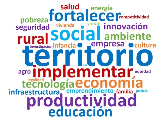 Finalmente, dentro del marco del análisis de los temas más importantes del texto del PND se produce una nube de palabras que le permite al lector comparar la frecuencia con la que estos aparecen en el documento. Una nube de palabras es una figura donde cada palabra mostrada tiene un tamaño que es proporcional a su frecuencia de aparición en el documento. De esta manera se pueden comparar visualmente las frecuencias de aparición de palabras de interés. Con el fin de mostrar resultados relevantes para el lector, las nubes de palabras omiten aquellas que no aportan al contexto del análisis, pero que no pertenecen al conjunto de stop words. Dado que esta es una herramienta visual, se evita saturar la imagen con exceso de palabras, por lo que se establece un límite inferior para descartar palabras cuya frecuencia de aparición sea baja.