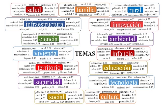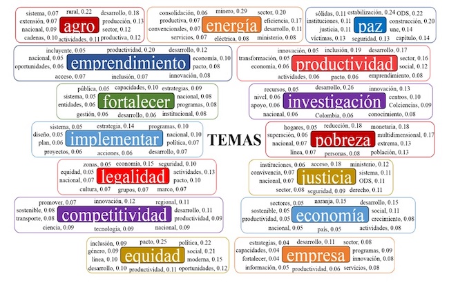 Las correlaciones más fuertes de cada tema son:3territorio-fortalecer, social-territorio (productividad), implementar-fortalecer, productividad-social (territorio), fortalecer-productividad, economía-social (productividad), rural-social (productividad), educación-salud, ambiente-social (economía), innovación-ciencia, empresa-productividad (territorio), salud-social, pobreza-rural, seguridad-social (legalidad), infraestructura-economía, cultura-economía, energía-productividad (territorio), infancia-social (familia), agro-productividad (territorio), emprendimiento-productividad (territorio), familia-social (infancia), competitividad-territorio (productividad), vivienda-social (rural), equidad-social (productividad), legalidad-economía, investigación-innovación, ciencia-innovación, justicia-legalidad y paz-justicia. Es interesante notar la baja correlación entre investigación-ciencia, agro-ambiente, pobreza-equidad y paz-cualquier tema entre las correlaciones bajas más notorias.