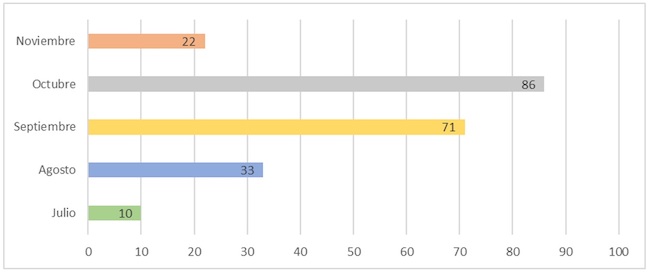 Se analizaron 222 publicaciones entre julio y noviembre de 2019, siendo octubre y septiembre los meses con más notas publicadas, ya que estos meses corresponden al centro de la temporada electoral (véase Gráfica 1; véase Anexo 4).