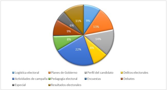 Temática electoral: consiste en las actividades que se realizan antes, durante y después de la campaña electoral. Las subcategorías son: logística electoral, planes de gobierno, perfiles de los candidatos, delitos electorales, actividades de campaña -como inscripción, apertura y cierre-, pedagogía electoral, encuestas y debates.