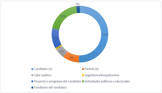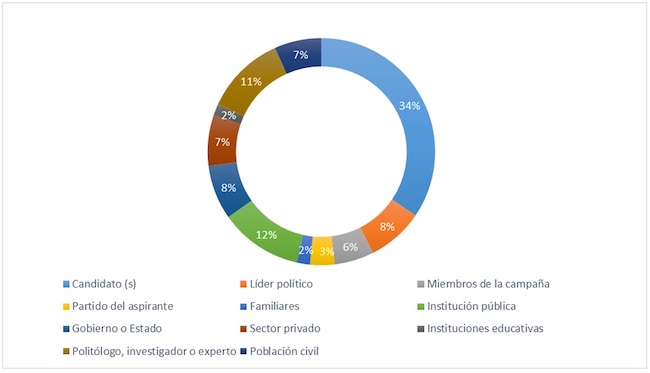 Fuentes: es de dónde proviene la información. Las subcategorías son: candidatos, miembros de la campaña, partido del aspirante, familiares, gobierno, sector privado, instituciones educativas, politólogo, investigador o experto, otro medio de comunicación o agencia de noticias, y población civil.