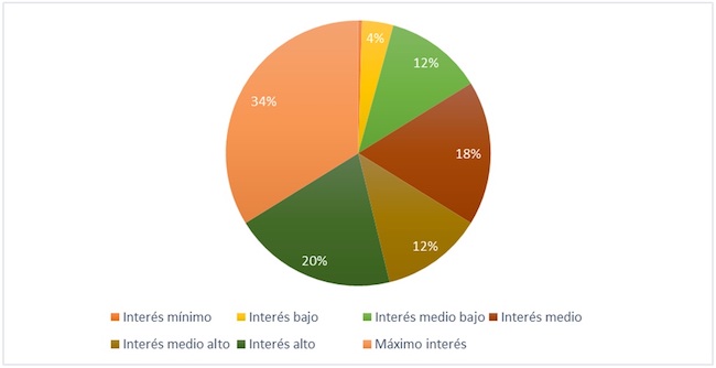 Para este punto se usó el índice de atención de Richard Budd (Pinzón, Ocampo y Gutiérrez, 2015). Este indicador aplicado a medios impresos lo que busca es demostrar cómo ese periódico usó la imagen, el espacio, la diagramación, el texto y el orden para darle mayor o menor relevancia a las publicaciones de su cubrimiento periodístico. La mitad de sus notas estuvieron entre el máximo de interés y el interés alto, incluso parte del otro 50% se ubicaron entre interés medio alto e interés medio (véase Gráfica 5). Se demuestra, por tanto, que el diario les sumó importancia y relevancia a sus notas para suscitar interés en el lector, es decir, las publicaciones del diario mantuvieron elementos para generar mayor impacto y así captar la atención a través de la imagen, la palabra, el espacio y el orden.