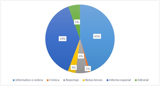 Respecto a esta categoría, se evidenció que el género periodístico más usado fue el informativo o noticioso (45%), esto hace alusión a la forma básica de presentar los hechos noticiosos, respondiendo a las preguntas qué, cómo, cuándo, dónde, por qué y para qué. También es el más sencillo para contar lo que ocurre en el ambiente político. Le siguen los informes especiales durante la temporada electoral (39%), en los que se destacan los perfiles de los candidatos, los análisis de sus planes de gobierno, las cifras de los resultados electorales y los análisis del panorama político de Manizales y de Caldas (véase Gráfica 6).