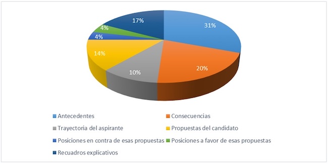 Contexto: los acontecimientos noticiosos no aparecen solos ni de la nada, tienen causas y derivación de otros hechos o situaciones. Las subcategorías son: antecedentes, consecuencias, trayectoria del personaje, propuestas del candidato, posiciones contrarias a esas propuestas y enfoque.