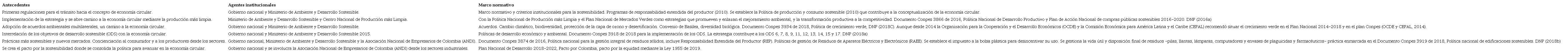 La hoja de ruta de la ENEC en Colombia, impulsada en noviembre de 2018 por el Ministerio de Ambiente y Desarrollo Sostenible, y en junio de 2019 por el presidente de la República, se fundamenta en un marco normativo y de políticas propuestos desde 2010. Este marco busca no solo la transición hacia la EC, sino que respalda a la ENEC en la medida que se definen los agentes que la impulsan y apoyan. En el cuadro 2 se hace una síntesis de los antecedentes y el marco normativo, así como los agentes institucionales de la ENEC.
