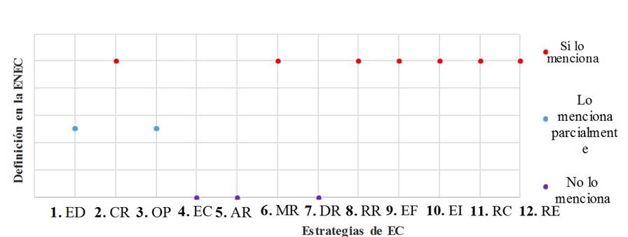 Si bien los criterios anteriores son un punto de partida en el análisis de políticas públicas, para el caso de la ENEC se tuvieron en cuenta dos marcos complementarios de análisis. El primero se concentra en la política pública en sí, a partir de la tradición de conjunto de políticas policy mix desarrollada por Karoline Rogge y Kristin Reichardt (2016) para revisar las transiciones. El segundo se concentra en el estudio de las estrategias mencionadas en el documento de la ENEC, a partir de la herramienta de las doce estrategias de EC indicadas por Quebec Circulaire (2021).
