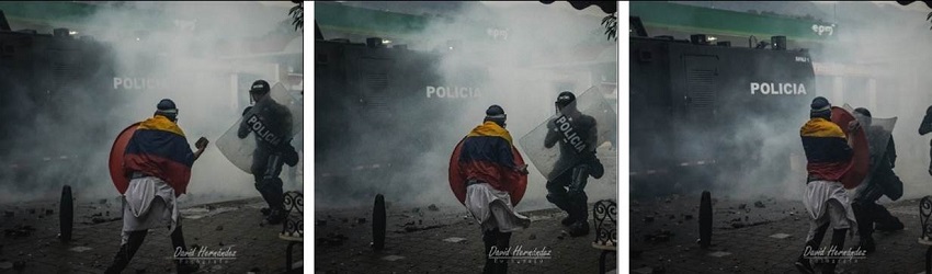 La secuencia tomada en Medellín por el fotógrafo David Hernández Ospina (3 de junio 2021) expresa este nuevo tipo de manifestación de los agentes. Georges Didi-Huberman (2020, p. 410) nos recuerda que en la manifestación aparece el gesto, las manos, los brazos extendidos: el cuerpo entero. ¿Qué es entonces lo que se manifiesta en esta secuencia?