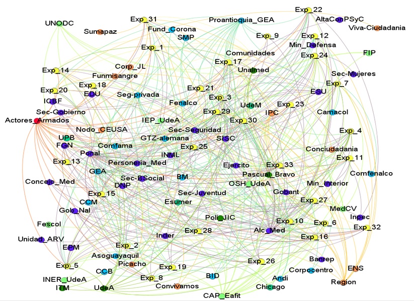 Una vez elaborada la base de datos a partir de las respuestas dadas por los expertos alrededor de las dos preguntas formuladas en relación con las instituciones y los actores sociales que intervienen en la gestión de la seguridad en la ciudad y, concretamente, el rol del sector privado, se hace uso del software Gephi para la construcción y análisis de redes sociales. La red se configura a partir de un conjunto de nodos y de un conjunto de aristas, en donde cada arista une a dos nodos. En este caso, se va tejiendo una urdimbre de relaciones entre diversos tipos de instituciones y actores sociales alrededor de las formas en las que se ha venido gestando el gobierno de la seguridad en Medellín.