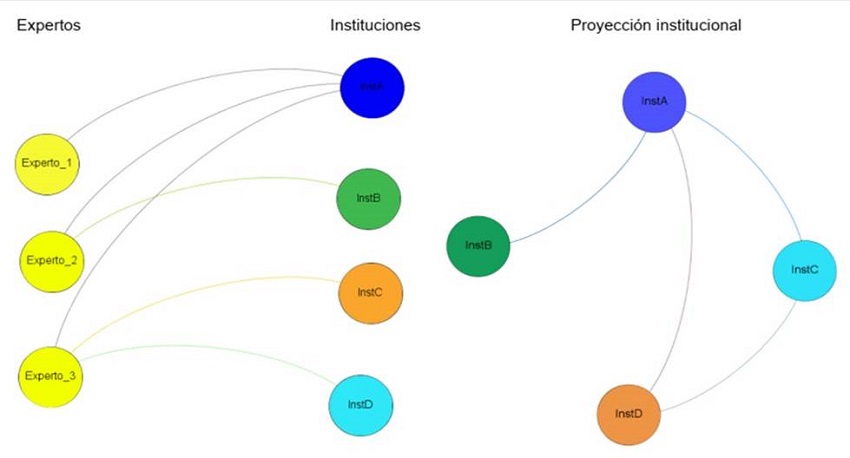 El resultado es una red bipartita, una red con dos conjuntos de nodos: expertos -informantes- e instituciones y actores sociales -informados-. A partir de esta red es posible generar una nueva red denominada «proyección», la cual conecta dos nodos del conjunto de instituciones si dichos nodos fueron informados por el mismo experto. Así, la InstA se relaciona con la InstB porque fueron ambas referidas por el Experto_2; de la misma forma, la InstA se relaciona con la InstC y con la InstD porque fueron referidas por el Experto_3; y así sucesivamente para cada uno de los expertos, de las instituciones y de los actores sociales que son referidos para la gestión de los problemas de seguridad en la ciudad (véase Gráfica 2).