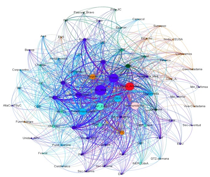 En relación con el primer aspecto, 59,46% de los nodos de la red corresponde con instituciones públicas -nodos de color azul oscuro- (36,49%) y privadas -nodos de color azul claro- diversas (22,97%). El 14,86% de los nodos de color naranja claro corresponde a ONG, mientras que 10,81% corresponde a diferentes centros de investigación, nodos de color verde claro en la red. El 12,17% de los nodos se relaciona con universidades públicas (6,76%) -color verde oscuro- y privadas (5,41%) -círculos de color verde más claro-. Finalmente, solo en 1,35% de los nodos de la red se referencian a organizaciones comunitarias -círculos de color rosa claro-, así como con la presencia de actores armados diversos -bandas, combos, entre otros- (1,35%), cuyos nodos en la red se representa por un círculo en color rojo.