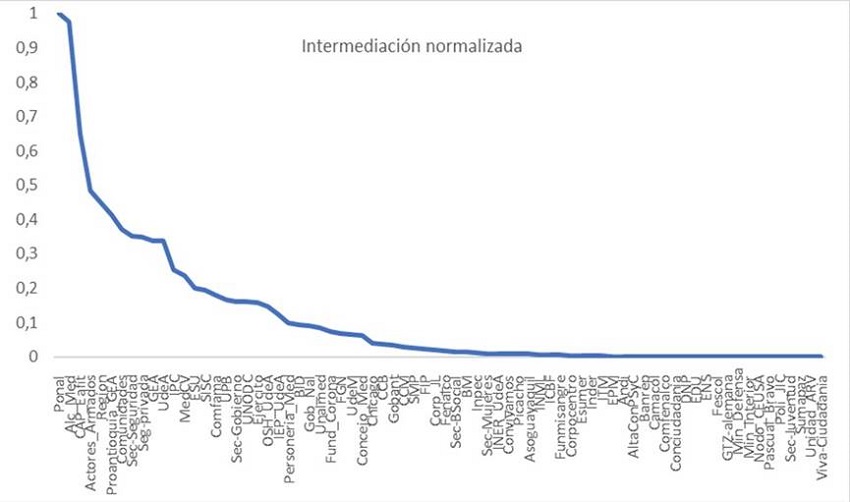 En el desarrollo de este artículo la medida de intermediación se presenta normalizada -con valores de 0 a 1-: en tanto más cercano a 1 esté la intermediación indica que dicho actor o institución ha sido referida por una mayor cantidad de expertos y, por tanto, es más importante en el gobierno de la seguridad en la ciudad. Correlativamente, cuando el valor de la intermediación esté más cercano a 0 significa que dicha institución o actor social ha sido referida por una menor cantidad de expertos y su relevancia también disminuye en la gestión de las políticas de seguridad en la ciudad.