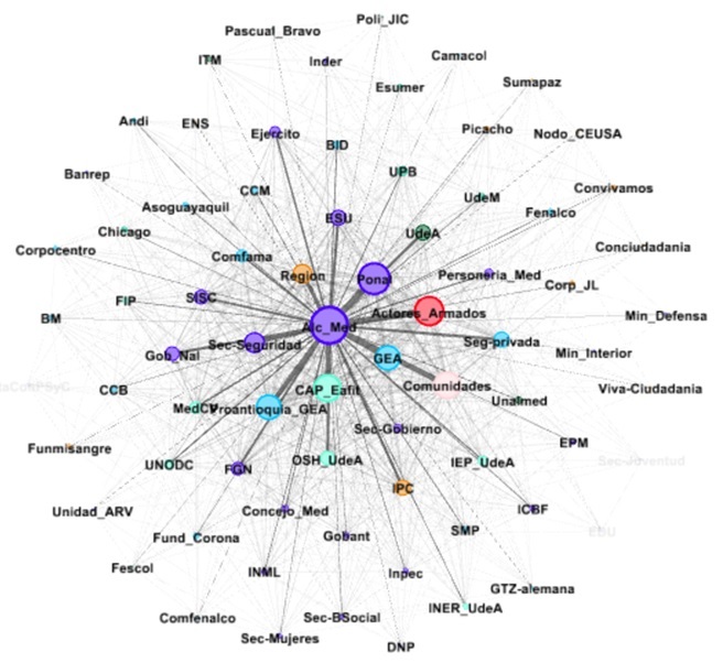 En el segundo nivel, rodeando al núcleo de la red, hay algunas ONG -Región, Instituto Popular de Capacitación (IPC)-, círculos de color naranja claro, y organizaciones comunitarias -barriales, de víctimas, veedurías- (Comunidades), el círculo de color rosa claro. Igualmente, están allí instituciones como las empresas de seguridad privada (Seg-privada), Comfama y Fundación Corona (Fund_Corona), representadas en la red por círculos de color azul claro. Asimismo, se observan otras instituciones como Concejo (Consejo_Med) y Personería de Medellín (Personería_Med) y Gobernación de Antioquia (Gobant) -nodos de color azul oscuro-, así como Medellín Cómo Vamos (MedCV) y Oficina de Naciones Unidas contra la Droga y el Delito (UNODC), Fundación Ideas para la Paz (FIP), Observatorio de Seguridad Humana (OSH_UdeA) e Instituto de Estudios Políticos (IEP_UdeA), ambos de la Universidad de Antioquia, nodos que representan en la red a centros de investigación con círculos de color verde claro. Igualmente, es posible observar algunas universidades públicas como Universidad de Antioquia (UdeA) y Universidad Nacional de Colombia, sede Medellín (Unalmed), cuyos nodos aparecen de color verde oscuro en la red.
