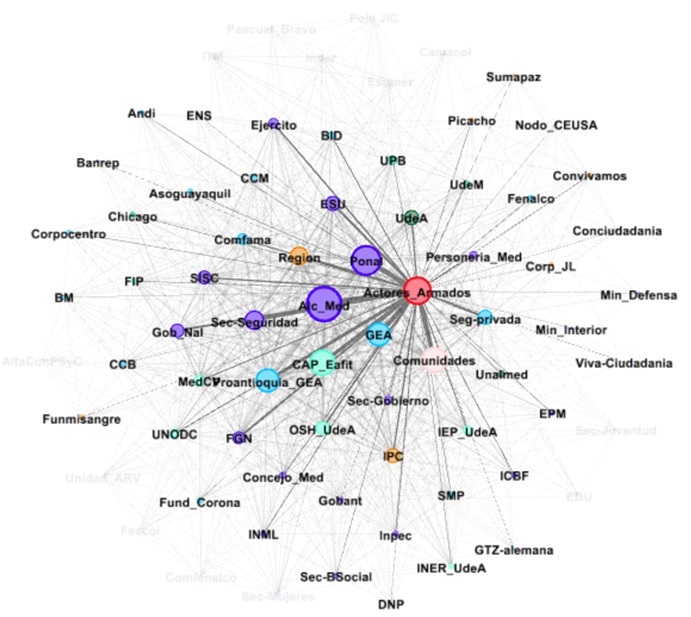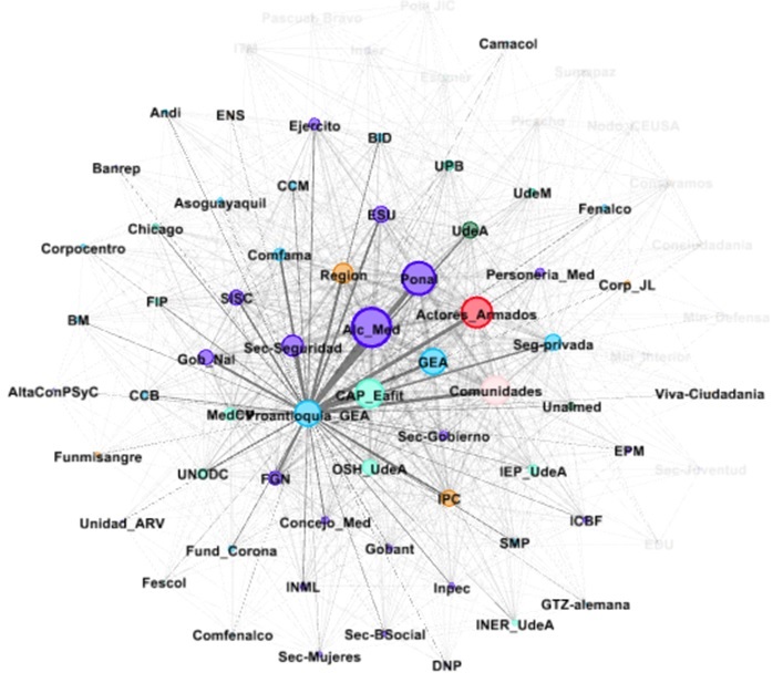 En relación con el segundo aspecto, en general, se pueden observar tres patrones o niveles principales en la red: el primer nivel en el núcleo de la red, en donde se pueden apreciar dos instituciones públicas gestionando el gobierno de la seguridad en Medellín, Alcaldía (Alc_Med) y Policía Nacional (Ponal), ambos nodos de color azul oscuro; a su alrededor, en el segundo nivel, hay un conjunto de instituciones públicas -Secretaría de Seguridad, Sistema de Información para la Seguridad y la Convivencia (SISC), Empresa para la Seguridad y Soluciones Urbanas (ESU), Gobierno Nacional (Gob_Nal), Fiscalía General de la Nación (FGN), Ejército, entre otras-, y algunas instituciones privadas como Grupo Empresarial Antioqueño (GEA), Fundación para el Progreso de Antioquia (Proantioquia), cuyos nodos se representan de color azul claro en la red, y una universidad privada, Universidad Eafit y su Centro de Análisis Político (CAP_Eafit), el círculo de color verde claro. Igualmente, aparecen en la red actores armados diversos como combos, bandas, entre otros que se representan por un círculo de color rojo.