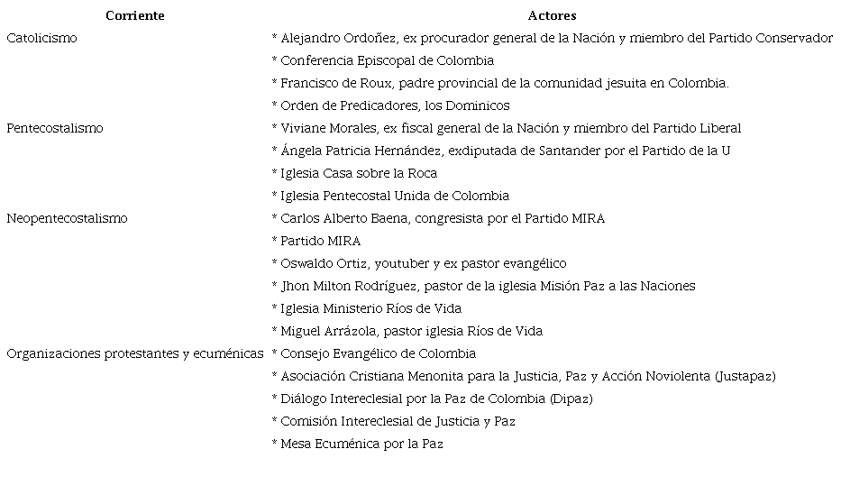 Así, uno de los sectores sociales que hizo parte de este debate fue el religioso, caracterizado por su diversidad en sus posturas alrededor del Acuerdo de La Habana, pero con ciertas figuras y líderes que poseían mayor visibilidad pública e influencia política que otros. Por ejemplo, se destacaron líderes de comunidades cristianas evangélicas, pentecostales y católicas debido a sus posiciones muy determinantes frente a la coyuntura que atravesaba el país; incluso, algunos medios nacionales llegaron a vincular el fracaso del Plebiscito por la paz con la posible influencia de las iglesias sobre los votantes, ocasionando que el Gobierno nacional decidiera, tras los resultados plebiscitarios, sentarse a renegociar el Acuerdo con estas iglesias.