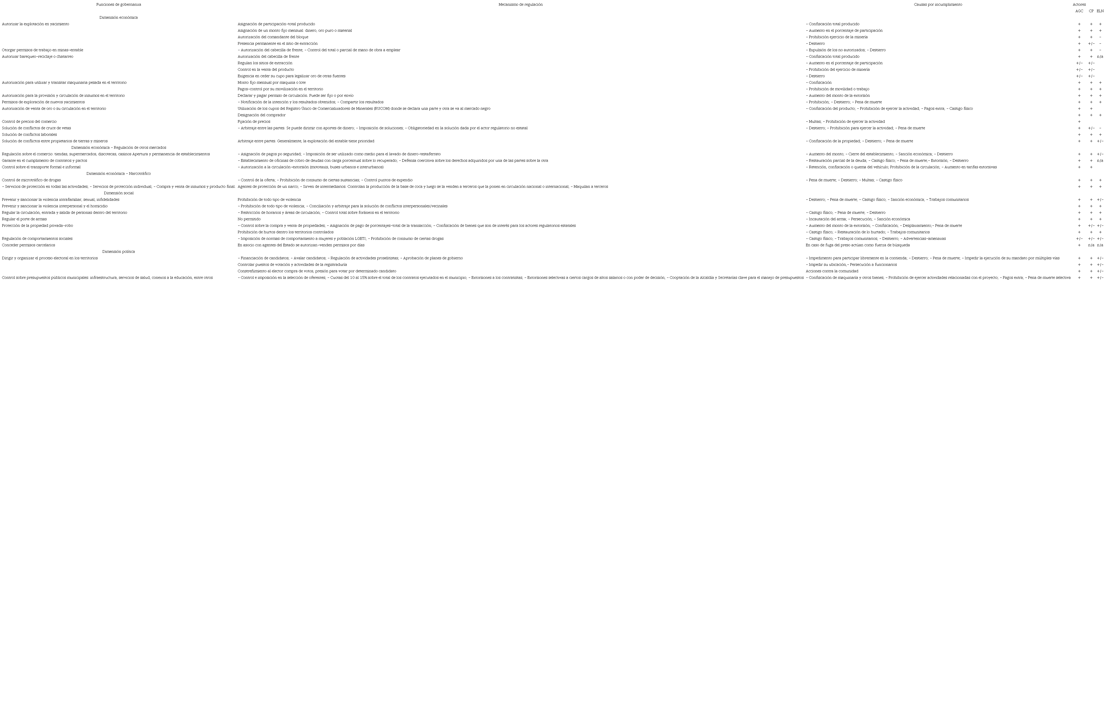 Basados en el modelo de gobernanza criminal de Benjamin Lessing (2020), adaptado a los contextos analizados y contrastado con entrevistados que ayudaron en su elaboración, se presenta el cuadro 1, la cual contiene un inventario de las funciones y mecanismos de regulación instituidos por los ARNE en las regiones de estudio. Para tener en cuenta la dimensión a analizar, se verificó que al menos dos de los entrevistados dieran cuenta de ella, contrastándose con la información directamente recopilada con los ARNE o ARE involucrados obtenida en entrevistas o información hallada en informes especializados y fuentes periodísticas.