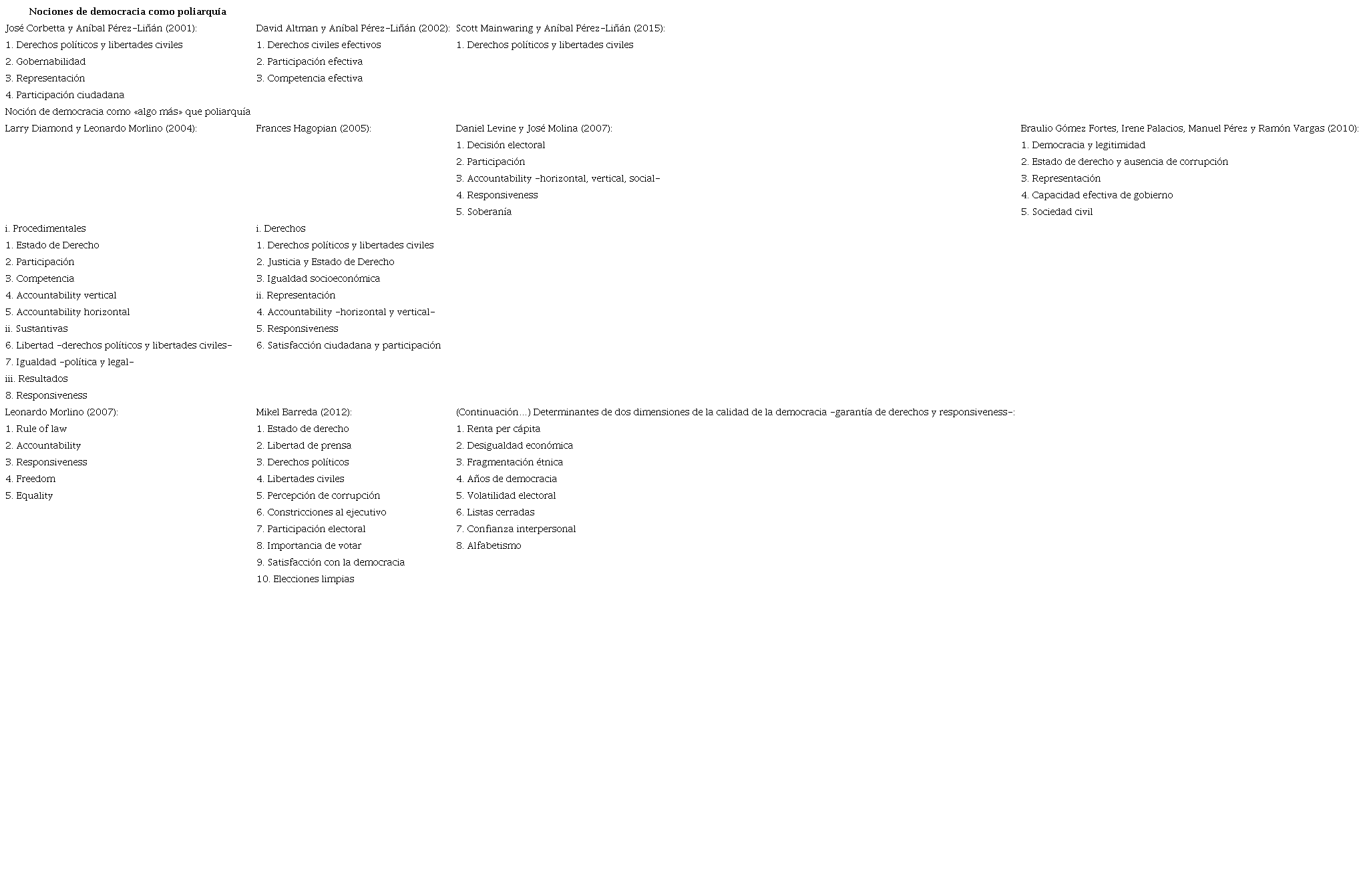 También están los trabajos que van más allá de la noción clásica de democracia que propone Robert Dahl (2022) -como son los de Larry Diamond y Leonardo Morlino (2004), Leonardo Morlino (2007), Frances Hagopian (2005), Daniel Levine y José Molina (2007), Braulio Gómez Fortes et al. (2010) y Mikel Barreda (2012) - y que «amplían el contenido de la democracia con aspectos sustantivos y finalistas. La democracia no sólo implica ciertos procedimientos para seleccionar y controlar el poder político, sino también objetivos y resultados que se pretenden alcanzar, tales como el desarrollo económico, la justicia social o la igualdad» (Barreda, 2012, p. 152).