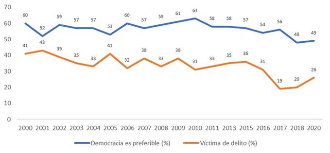 Y en efecto, las estadísticas disponibles evidencian una relación directa entre las variables de violencia y de criminalidad con las de calidad de la democracia. En la Gráfica 2 se plantea una relación entre el apoyo a la democracia en América Latina y las víctimas de delitos: aquellas contra el patrimonio -hurtos, robos, fraudes, chantajes, extorsiones, entre otros- y contra la integridad personal -lesiones personales, agresiones, violación, secuestro, entre otros-. Lo primero que se puede constatar es el porcentaje de personas agredidos o víctimas de un delito en los últimos doce meses. Se observa cómo el nuevo siglo comienza con un registro de 41%, aumentando a 43% para 2001 y desde allí hasta 2020 se presenta un comportamiento fluctuante entre 19% y 43% (Latinobarómetro, s. f.).