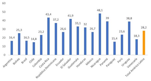 El 10% más rico de la población gana 22 veces más que el 10% más pobre, por lo cual el ratio de Kuznets de la región, el cual mide la distancia entre ricos y pobres, es más del doble del promedio del ratio de los países desarrollados. El coeficiente de Gini promedio en la región es de 0,46, mientras que en los países desarrollados es de 0,32 (Busso y Messina, 2020, p. 3).