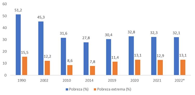 Estos programas de economía política se hacen más urgentes en la actualidad debido a que las ganancias que se lograron en este aspecto entre 1990 y 2020 se vieron destrozadas en el periodo de pandemia, en el que se reversaron los avances respecto a la pobreza extrema (Cepal, 2022), y en general por el estancamiento de estructuras económicas poco productivas y por los altos índices de informalidad que bordean 50% de la población (CAF, 2022, abril 6) (véase Gráfica 4). Según los datos que se tienen hoy, un tercio de los habitantes de la región son pobres (32,1%), cerca de 201 millones de personas, de los cuales están en pobreza extrema 13,1%, es decir, 82 millones de personas (Cepal, 2022).