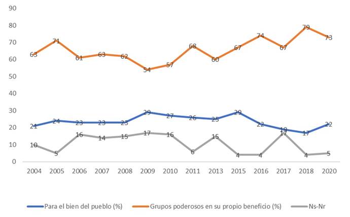 El segundo tipo de programas son aquellos dirigidos a fortalecer la confianza en las instituciones del sistema democrático -en el poder legislativo, el poder judicial y los partidos políticos-. Formas de aumentar la confianza con programas anticorrupción, dirigidos a aumentar la transparencia en el uso de recursos públicos y sistemas de rendición de cuentas. Estilos de gobierno más cercanos a la gente, que permitan cambiar la percepción de que los gobiernos están al servicio de la ciudadanía y no de los grupos económicos más poderosos, como se muestra en la Gráfica 5. La idea es que ante la pregunta «¿para quién se gobierna?» las respuestas aumenten por la opción «para el bien del pueblo».