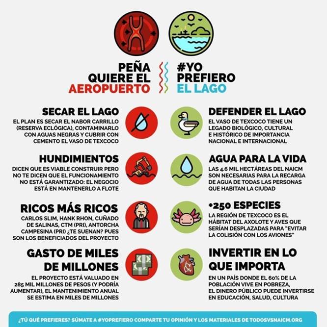 La coyuntura de la elección presidencial de 2018 fue el escenario de confrontación política donde la construcción del NAIM sintetizó simbólicamente la contraposición entre dos proyectos de país cada uno con sus propios «lenguajes de valoración» (Martínez-Alier, 2005). Por un lado, los intereses detrás del NAIM incluían el Grupo Atlacomulco, una fracción del Partido Revolucionario Institucional (PRI) que dominaba el escenario político regional, al cual pertenecía el entonces presidente Enrique Peña Nieto, aliado con grandes grupos económicos como el Consejo Coordinador Empresarial y la Confederación Patronal Mexicana. Por otro lado, estaba el candidato Andrés Manuel López Obrador, cuya bandera de programa incluía medidas redistributivas y combatir la corrupción, con un discurso crítico de los grupos de poder dominantes durante los últimos treinta años. Al candidato lo acompañó una amplia convergencia de intereses populares, movimientos indígenas, campesinos, defensores del ejido y proyectos comunitarios como el FPDT, también ecologistas y organizaciones ambientalistas interesados en la preservación y recuperación del lago de Texcoco y organizaciones de derechos humanos acompañantes de los procesos como los sucedidos en Atenco. En su campaña, el candidato López Obrador prometió, de llegar a la Presidencia, cancelar el NAIM por el alto costo que significaba para el erario público y por presuntos actos de corrupción (Encinas, 2014).