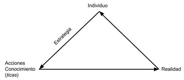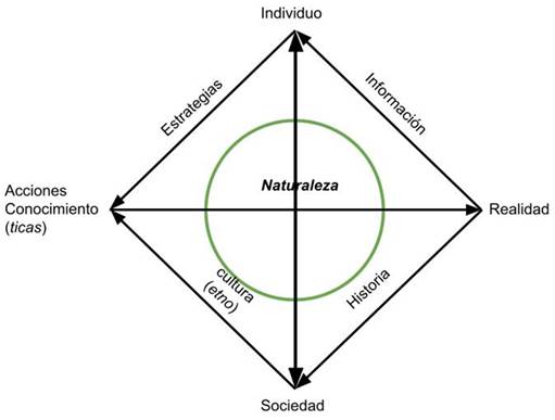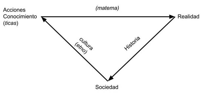 El esquema muestra que el individuo, al ser informado por la realidad natural y sociocultural, establece estrategias que le permiten actuar en congruencia con el contexto, aplicando sus conocimientos por medio de acciones que incorporan nuevos hechos como artefactos o mentefactos en la realidad. De esta forma, la realidad se va transformando por medio de acciones que actualizan el conocimiento del individuo que desde la propuesta de D’Ambrosio (2013) no se limita a lo racional, sino que involucra lo sensorial, lo intuitivo y lo emocional.