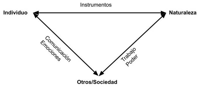 Ahora bien, aunque el conocimiento producido por los individuos y la sociedad transforman la realidad, no la determinan completamente, puesto que la naturaleza está en su base -es inabarcable- y constituye el soporte principal de la vida. Esta triple relación entre el individuo, la sociedad y la naturaleza, conforma lo que D’Ambrosio (2007) denomina el triángulo primordial de la vida (véase Gráfica 3).